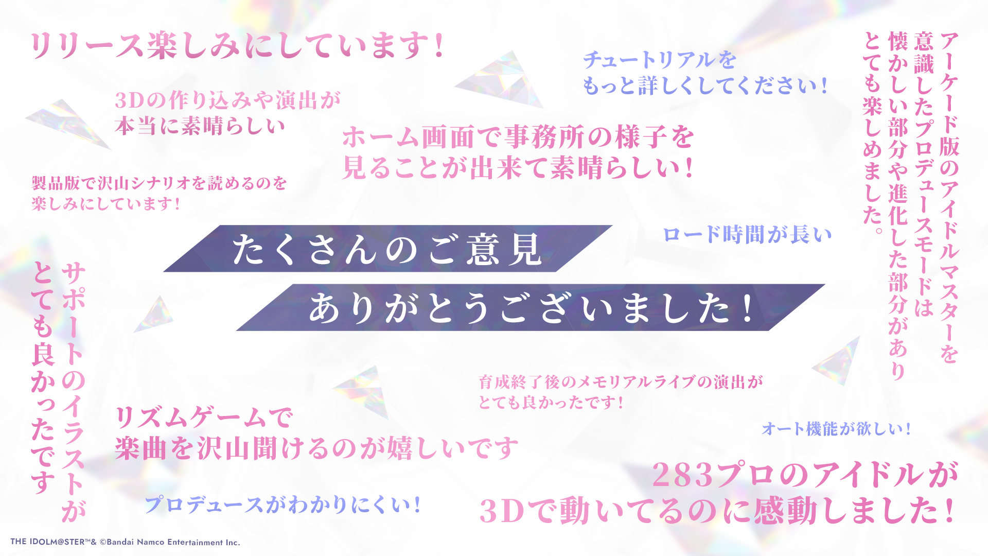 テストプレイにご参加いただいたプロデューサーの皆さまのアンケート結果や、期間中のプロデュース活動を「シャニソン」公式サイトに掲載しております。
