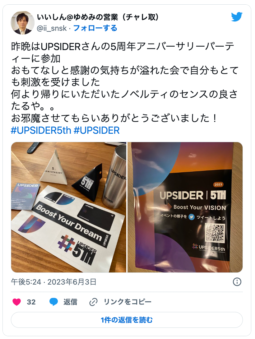 「ありがたいことに、UPSIDERはサービス開始から2年半で、合計2万社以上の挑戦者の方々と同じ船に乗らせていただいています。私たちへの信頼と、これまでのパートナーシップに心から感謝を申し上げます。」