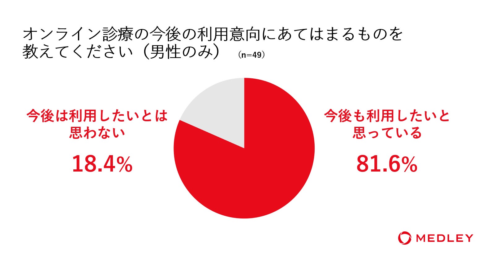 また、オンライン診療利用者に今後の利用意向を聞いたところ、8割以上の人が「今後も利用したいと思っている」と答え、継続利用の意向が非常に高いことが伺えます。