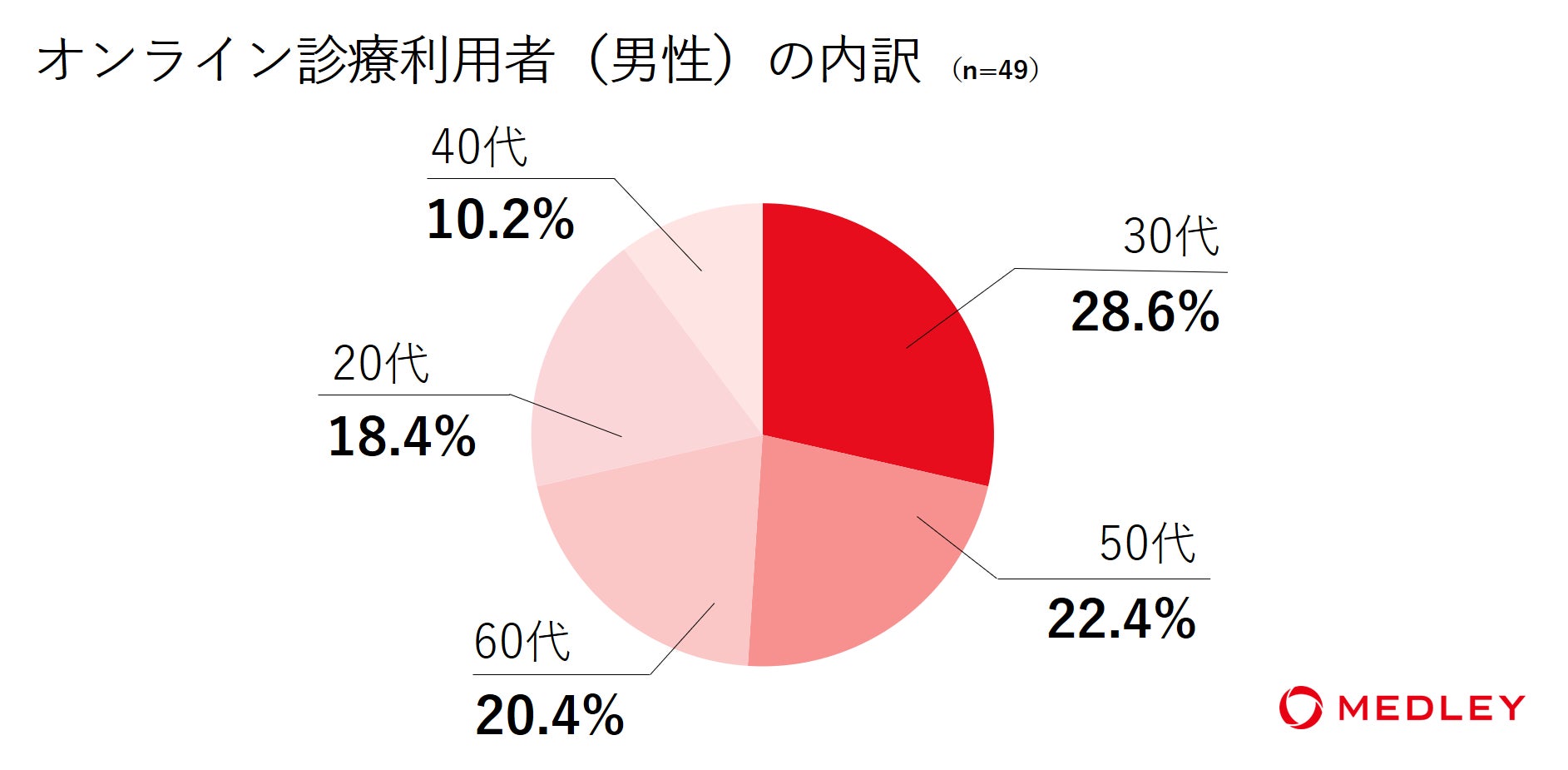 調査結果から、男性のオンライン診療の利用経験者を年代ごとに比較したところ、1位が30代男性(28.6%)、2位は50代男性(22.4%)、続いて、3位が60代男性(20.4%)という結果になりました。デジタルネイティブ世代の20代男性は18.4%と50・60代男性と比較して少なく、働き盛りの父親世代のほうがオンライン診療を活用している傾向が高い結果となりました。