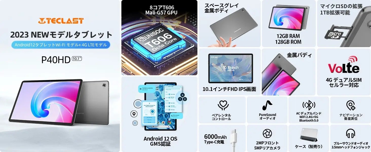 10インチ / Android 12 / 12GB(6+6GB拡張)+128GB+1TB拡張 / FHD IPSディスプレイ / Widevine L1対応 / 4G LTEモデル+WIFIモデル / 3.5mmヘッドホン / GPSサポート