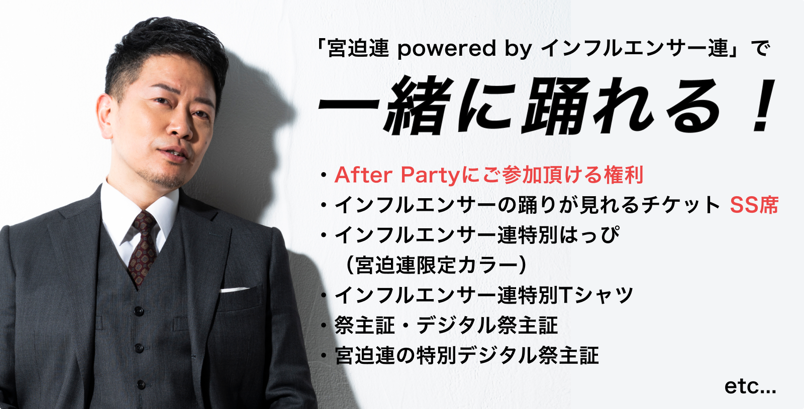 ※「宮迫連 powered by インフルエンサー万博」以外にも一緒に踊れる連はございます。詳しくはクラウドファンディングページをご確認くださいませ。