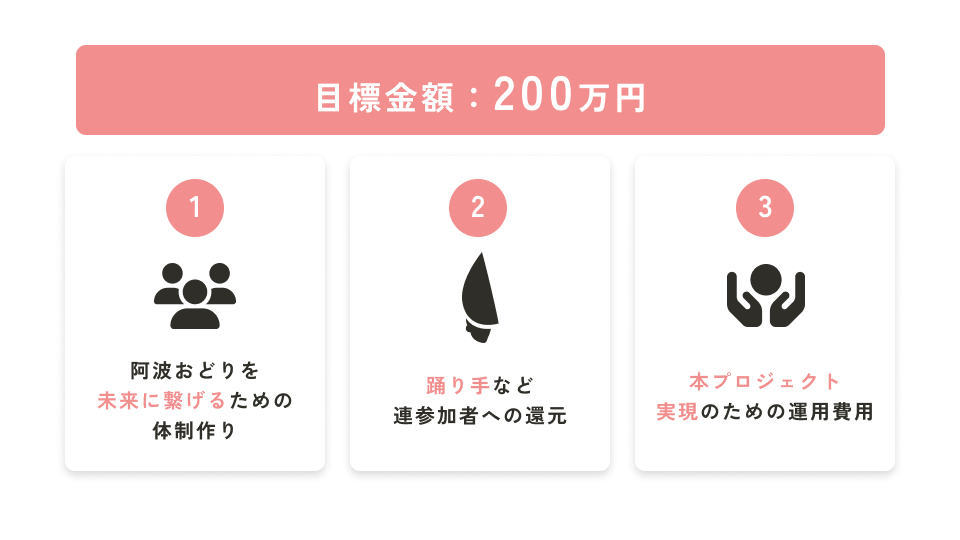 今回のクラウドファンディングでは、これまでの阿波おどりでは実現することの難しかった、阿波おどりを応援したいという思いを持つすべての方々の思いをカタチにすることと、阿波おどりを未来へ継承するための仕組みの構築をめざしています。