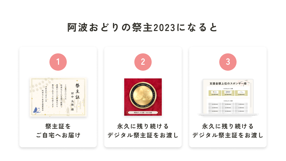 徳島県内や近郊の方々だけでなく、日本全国、あるいは世界中にいる阿波おどりを愛する全ての人々が本クラウドファンディングへの参加を通じて、「阿波おどりの祭主2023」としてお名前を永久に残していく仕組みです。ご支援いただいた実績を、公式ウェブサイトに掲載するほか、紙面で「祭主証」をお届け。さらに改ざんすることができず、未来永劫残り続けるデータとして「阿波おどりのデジタル祭主証」としてお渡しいたし、お届けいたします。この「一口祭主」は日本で初めての取り組みです。