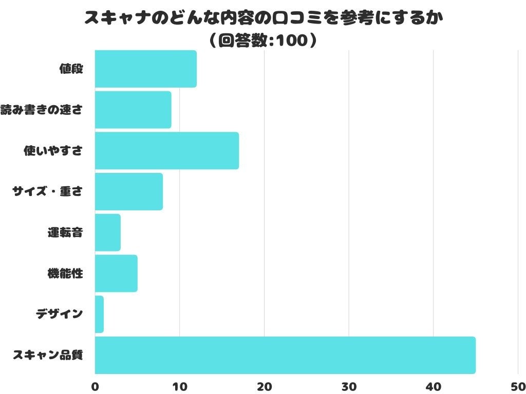 スキャナのどんな内容の口コミを参考にするかをアンケートにて調査したところ、1位は「スキャン品質」でした。