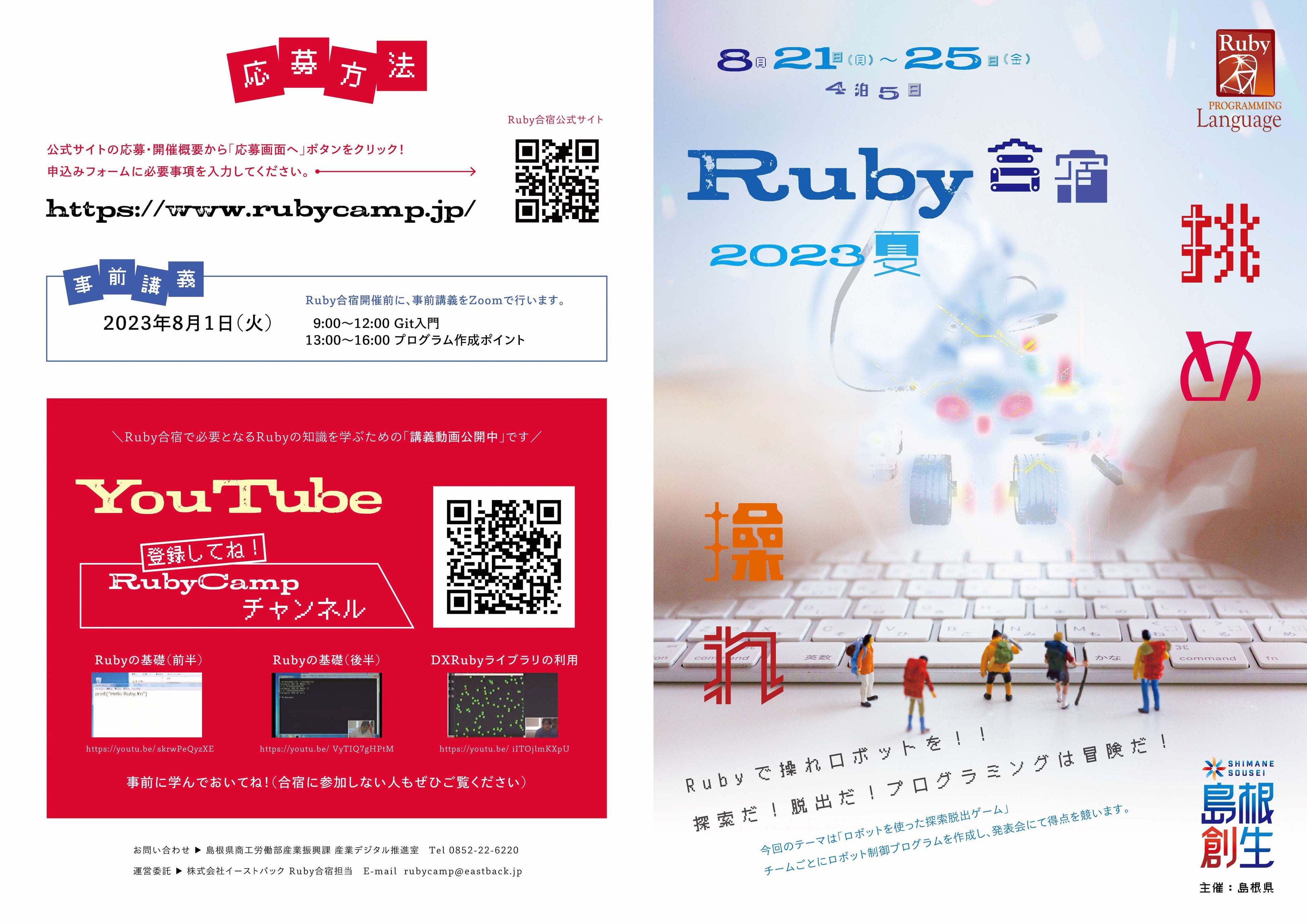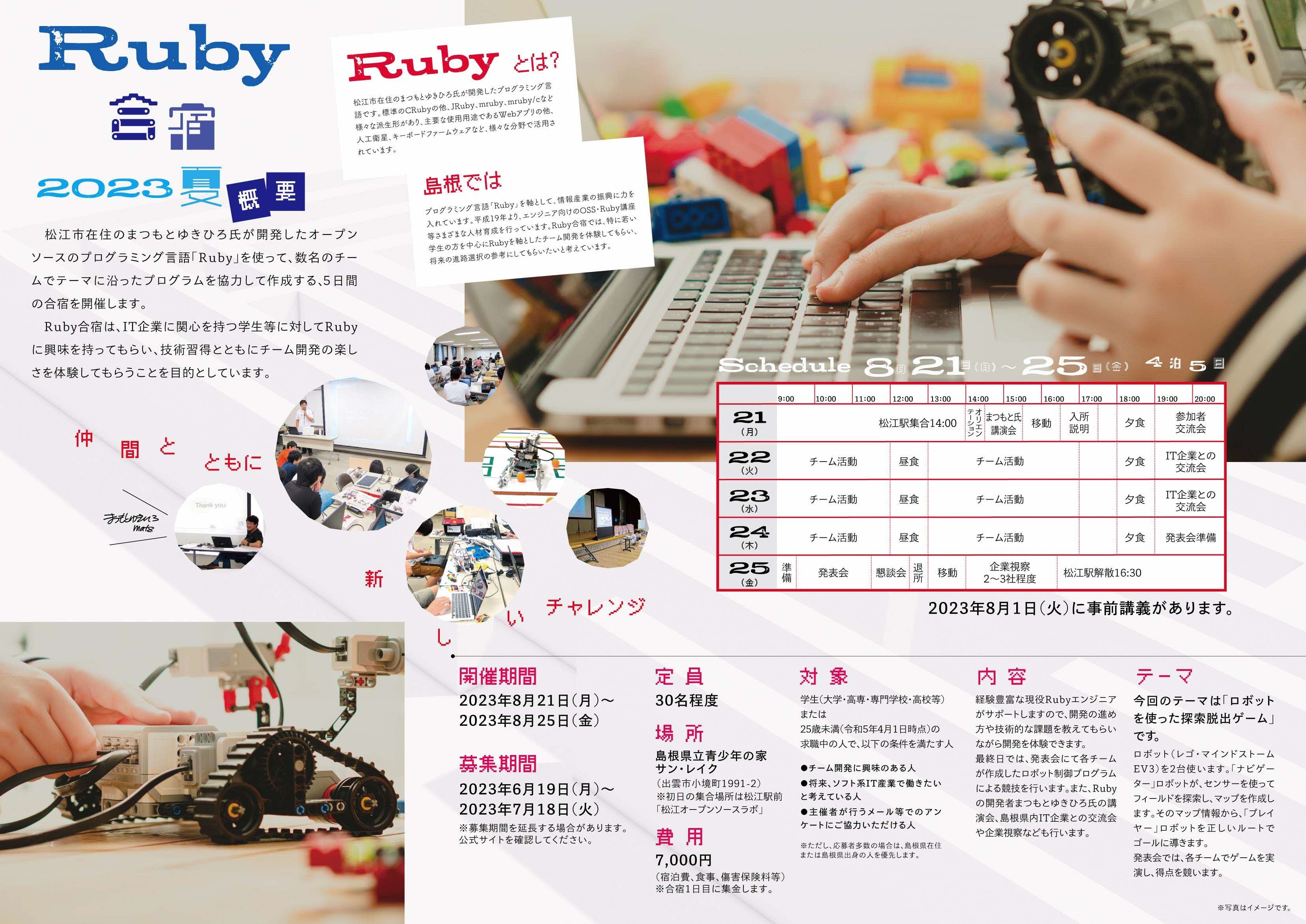 島根県は、学生・25歳以下の若者を対象に、プログラミング言語「Ruby」を使ってチームでのプログラミングを体験する4泊5日の合宿「Ruby合宿2023夏」の参加者を募集します。