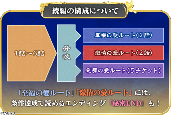 ①続編では、「至福の愛ルート」「激情の愛ルート」「刹那の愛ルート」の3つのルートに分岐し、「至福の愛ルート」「激情の愛ルート」では、条件達成で極上のエンディングもお楽しみいただけます。