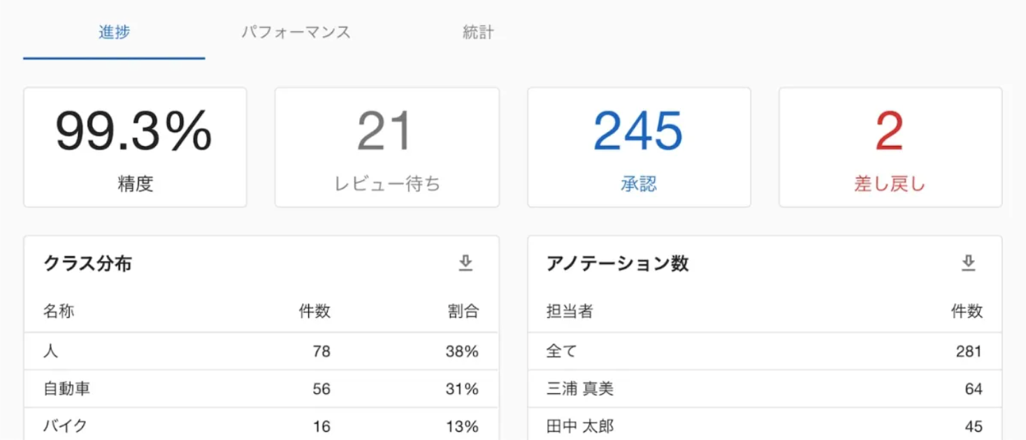 アノテーター、レビュワー、承認者の承認フローの設計、並びに作業進捗の可視化をすることが可能です。