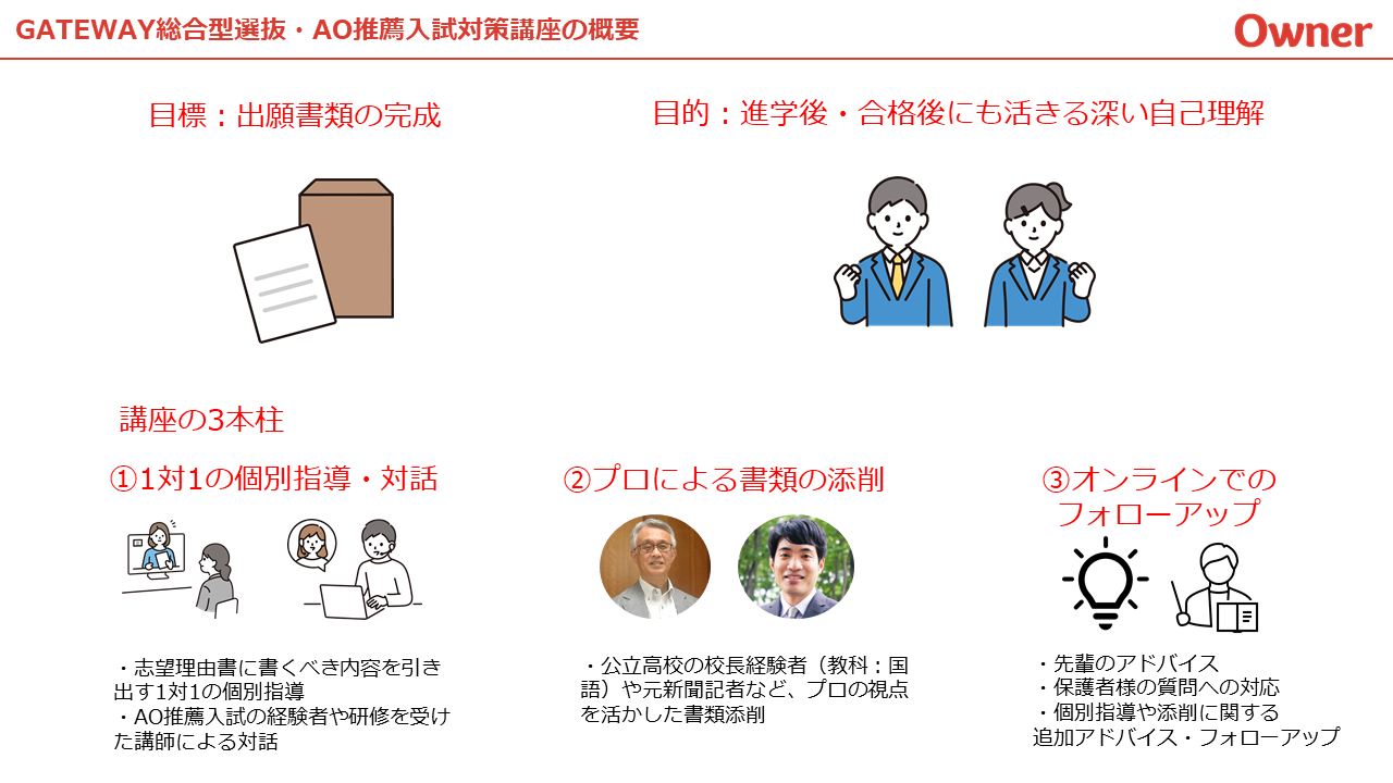 株式会社オーナーは、2023年4月より探究学習のオンライン教材「GATEWAY」を無料で公開しており、良質なWEBコンテンツを無料で届けることで、全国の高校生の探究学習を支援しています。今回の総合型選抜・AO推薦入試対策講座のサービス開始により、探究学習の成果を活かした総合型選抜・AO推薦入試へのチャレンジを一貫してサポートいたします。