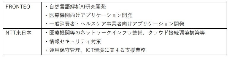 本協業においては、FRONTEOの自然言語解析(人が日常的に用いる会話・テキスト等のデータを解析する)AI技術や製品開発力、NTT東日本のICTソリューションやネットワーク、保守・運用体制といった両社の強みと知見、ノウハウを生かし、メンタルヘルス領域をはじめとする一般消費者・患者・ヘルスケア事業者・医療機関等へのサービス提供を目指します。また、診断支援だけでなく、未病を含む病気や不調の予防・早期発見につながる仕組みの推進に向け、医療ヘルスケア分野の発展に寄与する互恵的な協力関係の構築に取り組みます。