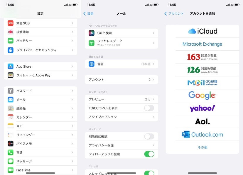 Step3、iPhoneで「設定」→「メール・連絡先・カレンダー」を選択します。「アカウント」をタップし、古いAndroidデバイスで使用していたGoogleアカウント情報を入力します。