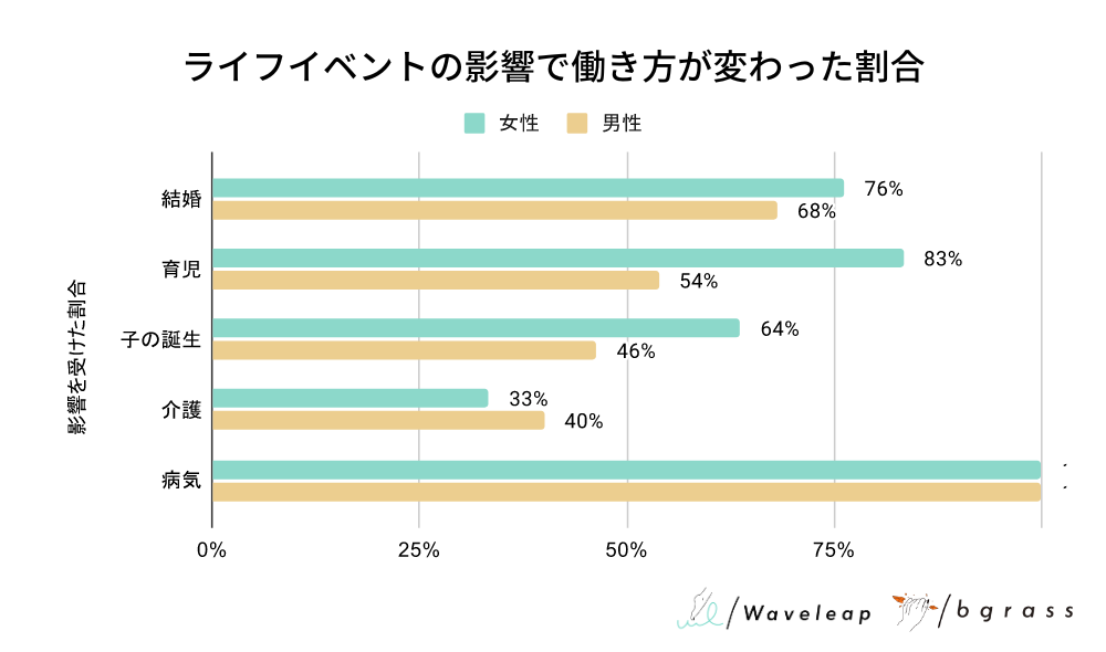 女性は「結婚」「育児」「子の誕生」で男性よりも働き方に影響を受けている割合が多いという結果になりました。特に、「育児」(女性83.3%、男性53.3%)「子の誕生」(女性63.6%、男性46.3%)での差が大きく、ライフイベントが女性のキャリアや働き方に与える影響は大きいということがデータとして可視化されました。