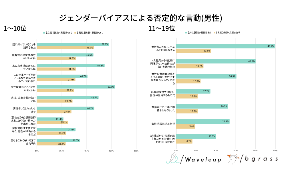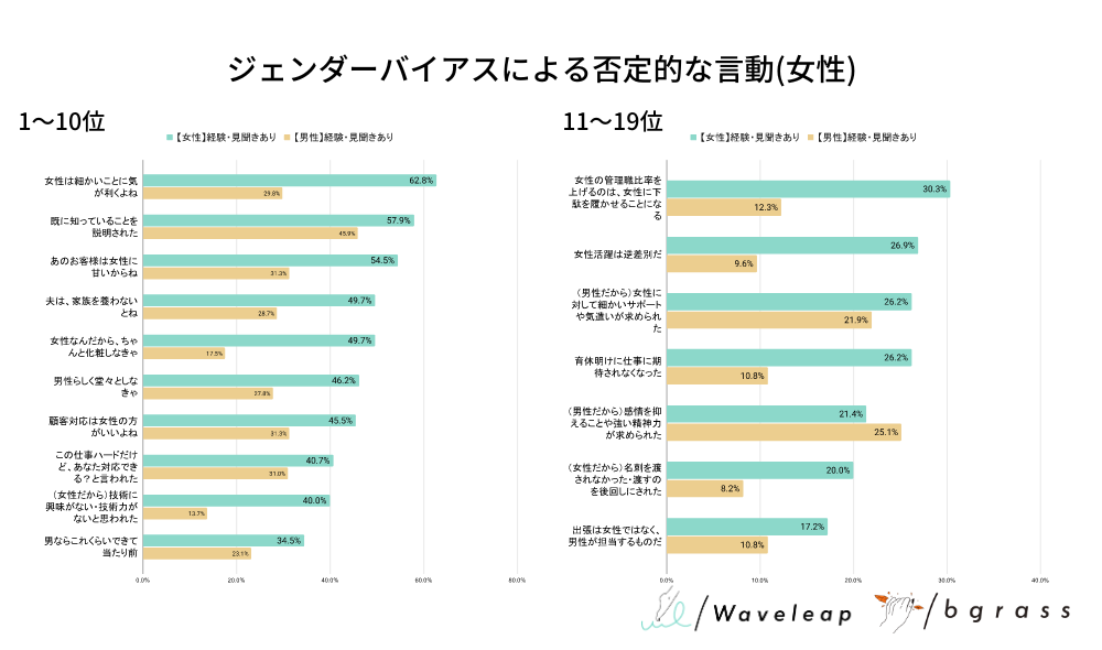 ジェンダーバイアスによる言動について調査しました。「経験あり」「見聞きあり」でカウントしたところ、トップ5は以下の結果となりました。男女ともに女性に対するジェンダーバイアスを見聞き・経験したことが多いという結果となりました。