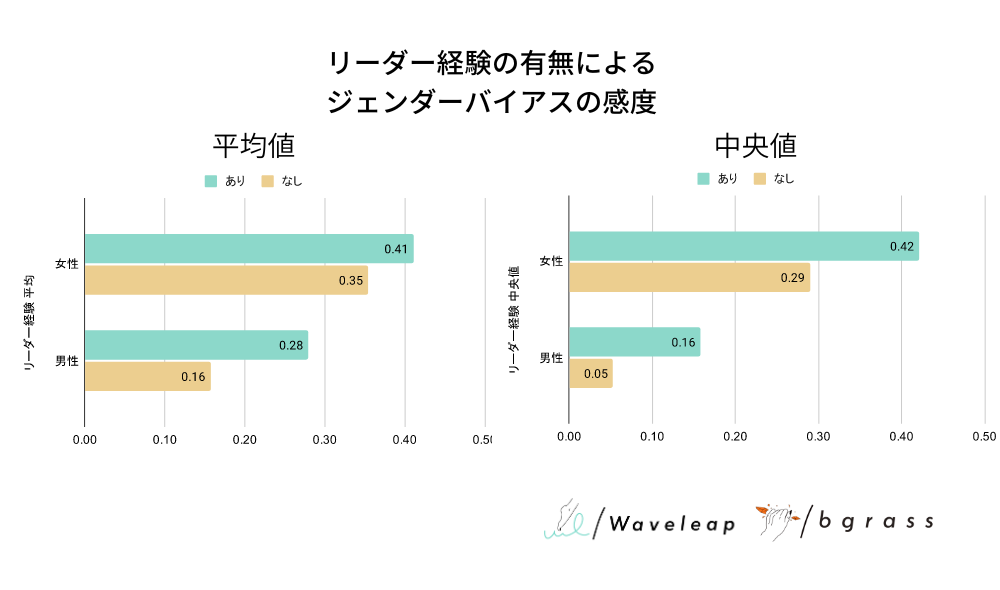 ジェンダーバイアスの感度の中央値は、リーダー経験の有無により、女性の場合は0.13の差(有0.42、無0.29)、男性の場合は0.11の差(有0.16、無0.05)となりました。子供の有無は、女性の場合は0.05の差(有0.37、無0.32)、男性の場合は0.16の差(有0.21、無0.05)となりました。