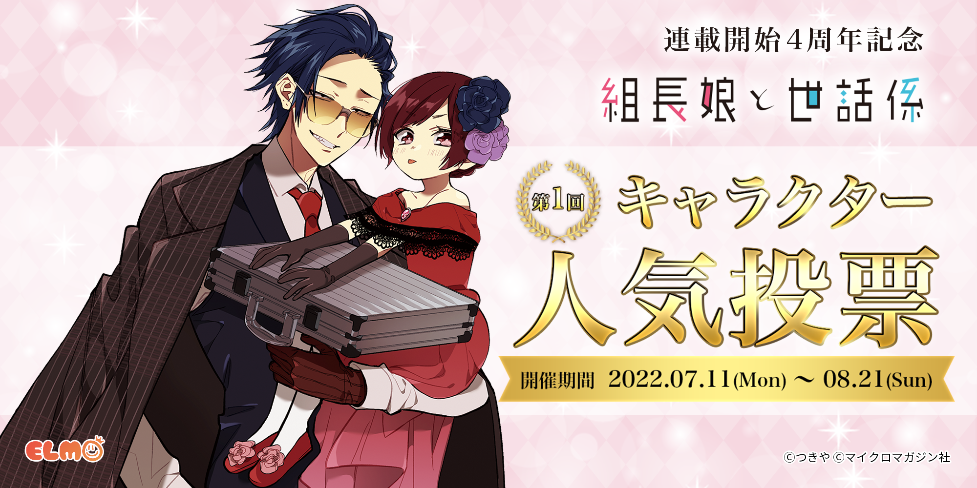 『組長娘と世話係』連載開始4周年を記念し、第1回キャラクター人気投票を2022年8月21日まで開催しています。結果発表では、投票結果1位~10位のキャラクターをつきや先生が描いた「描き下ろしメモリアルイラスト」を公開!さらに人気投票1位のキャラクターは、特別描き下ろしイラストで商品化も!