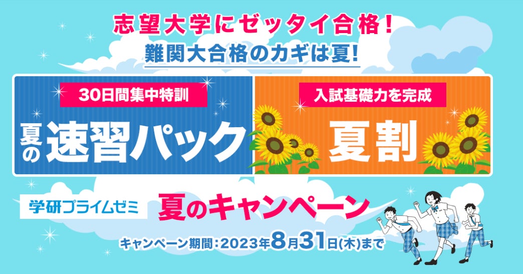 そこで学研プライムゼミでは、夏限定の「速習パック」&「夏割」講座を限定販売する「夏のキャンペーン」を実施、頑張る受験生を強力にバックアップします。