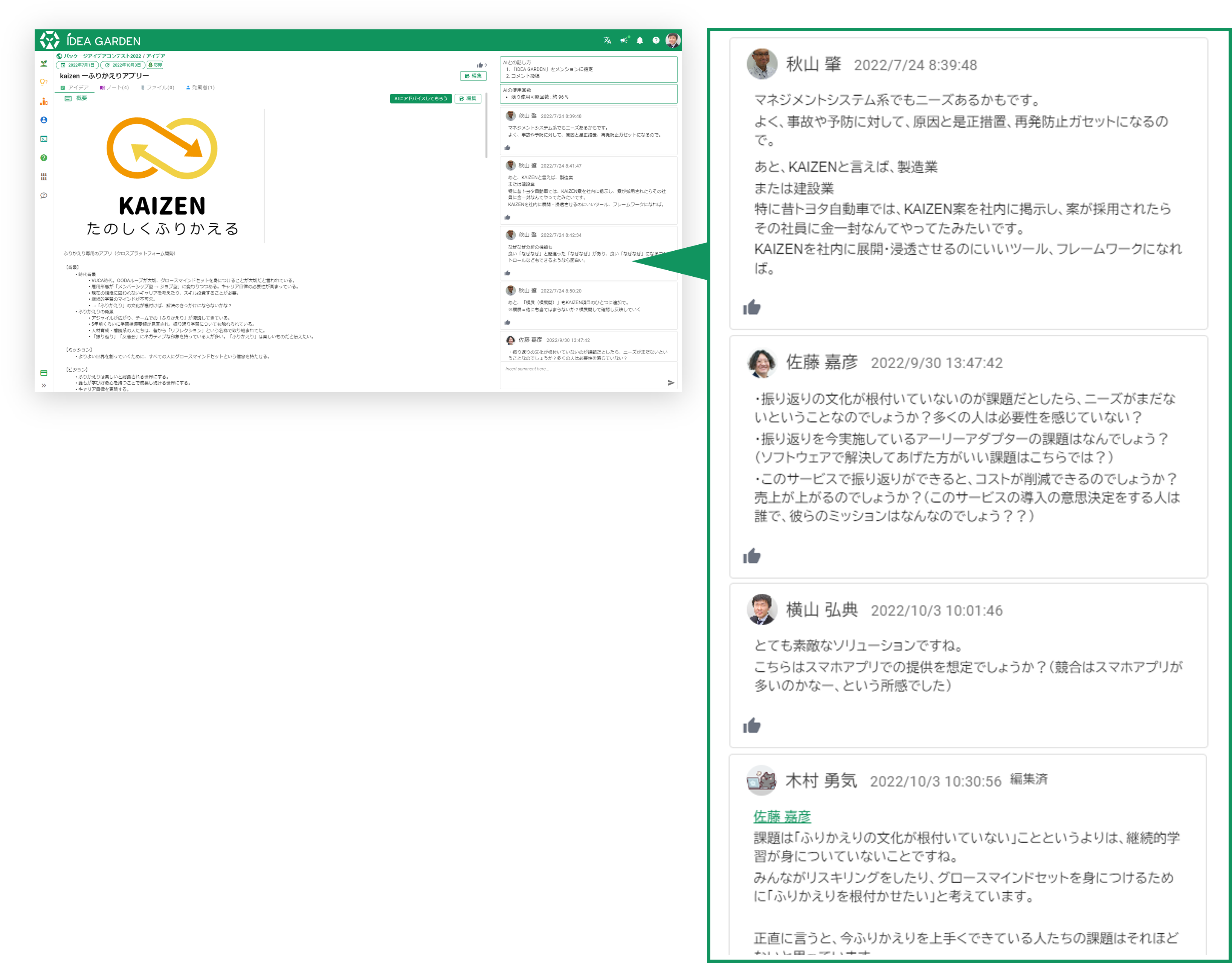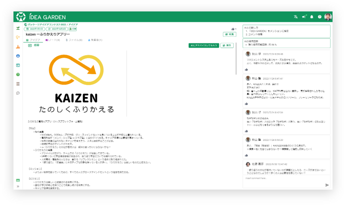 IDEA GARDENは、当社が新事業や新製品を生み出してきた知見に基づいたアイデアの発想・育成・蓄積の仕組みをクラウドサービス型の専用ツールとして提供する、全員参加型のアイデア創出プラットフォームです。GPT-4を使ったAI機能も活用しながら、アイデアをつくる社員と育てる社員、それぞれが強みを活かしてアイデアの発想・育成・企画化に貢献できる仕組みづくりを実現します。