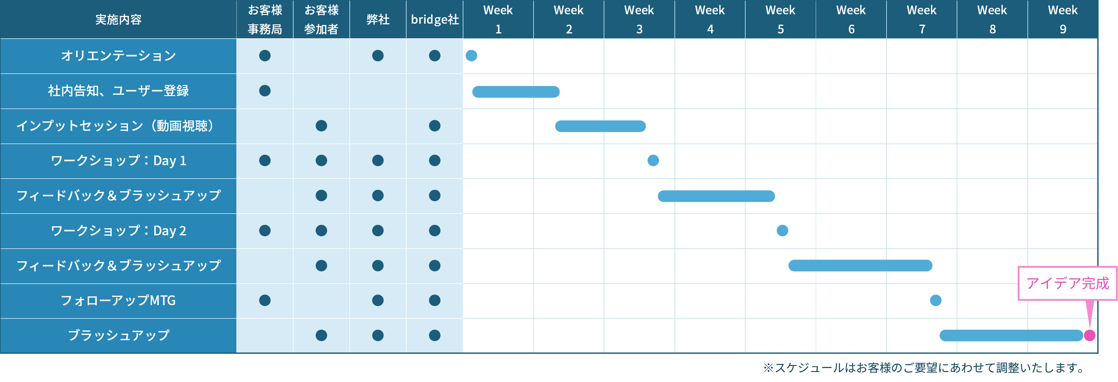 そこでこのたび開始したプロフェッショナルサービスでは、「事業を創る『人』と『組織』をつくる」をビジョンに掲げるbridge社と、「全員で生み出す文化をつくる」をビジョンに掲げるIDEA GARDENの強みを活かし、これまでワークショップのファシリテーションや事業開発支援の豊富な経験で培った知見を2カ月間のプログラムとして集約しました。