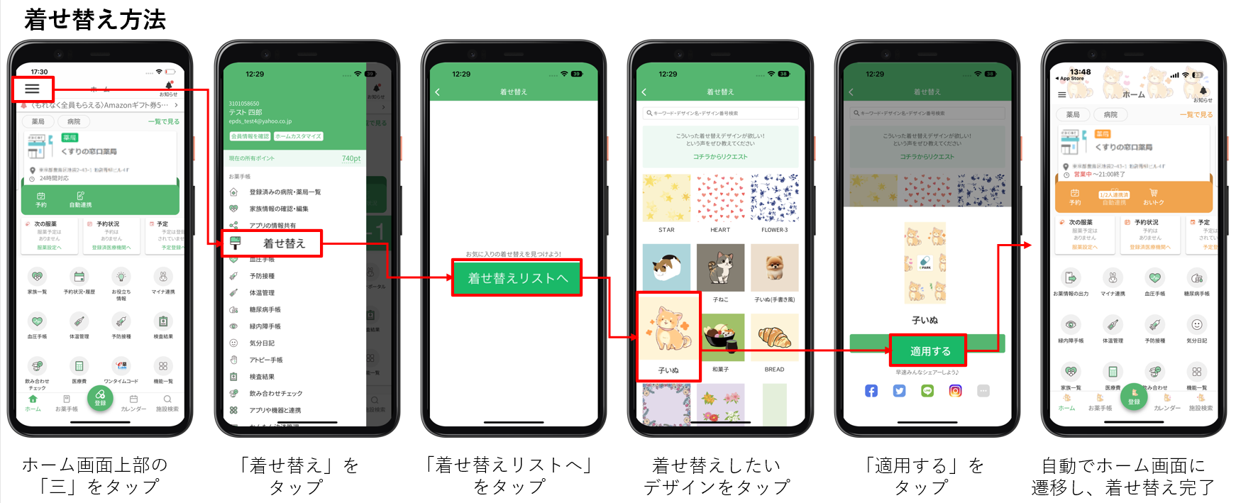 薬局で配布、または市販されている紙のお薬手帳では、キャラクターや和柄などの様々なデザインが展開されています。お薬手帳アプリも自分好みのデザインにすることで、日々のお薬の管理に対する意識向上につながると考え、当機能の提供開始に至りました。