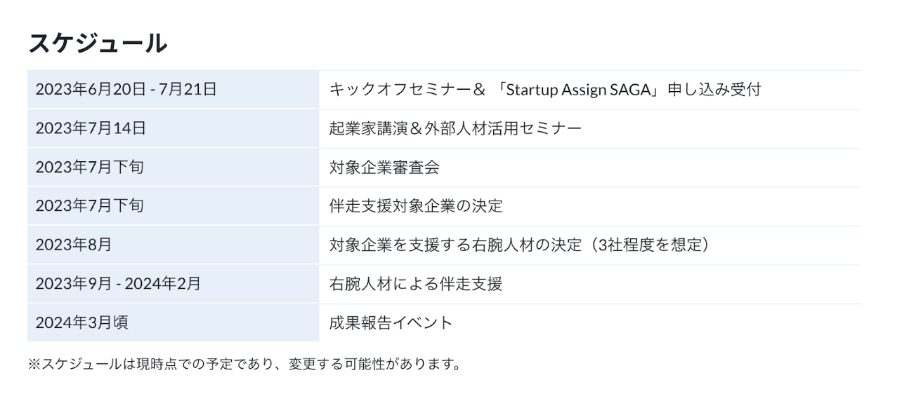 「Startup Assign SAGA」は、佐賀県がこれまで行ってきた個別指導プログラムに採択されたり、県が主催するビジネスプランコンテストで受賞したスタートアップ企業が主な対象で、デジタルマーケティングや資金調達、海外展開など、各企業が今後強化を目指す領域に応じて最適な社外プロを「右腕人材」としてマッチングし、約6ヶ月の伴走支援を提供する取り組みです。県内スタートアップ企業の成長を促進すると共に、将来的な経営人材の創出を目指しています。