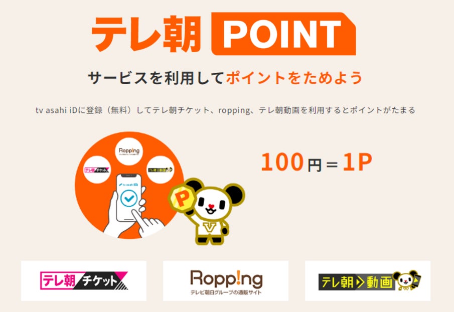 「テレ朝ポイント」は、テレビ朝日が提供する共通ID「tv asahi iD」の会員を対象に、動画配信サービス「テレ朝動画」や電子チケットサービス「テレ朝チケット」でのチケット購入、グループ会社の(株)ロッピングライフが運営する通販サイト「ロッピング」でのお買い物、テレビ朝日が実施するプレゼント応募等のキャンペーン参加で「テレ朝ポイント」を付与するサービスです。