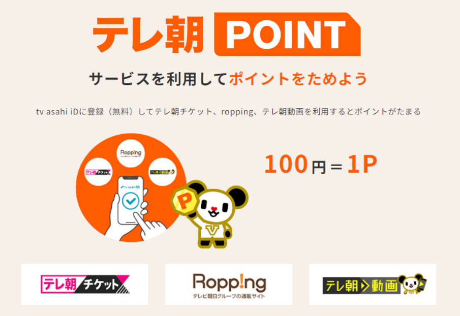 「テレ朝ポイント」は、テレビ朝日が提供する共通ID「tv asahi iD」の会員を対象に、動画配信サービス「テレ朝動画」や電子チケットサービス「テレ朝チケット」でのチケット購入、グループ会社の(株)ロッピングライフが運営する通販サイト「ロッピング」でのお買い物、テレビ朝日が実施するプレゼント応募等のキャンペーン参加で「テレ朝ポイント」を付与するサービスです。