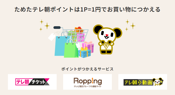 貯まったポイントは「テレ朝動画」、「テレ朝チケット」、「ロッピングライフ」のお買い物で1ポイント=1円としてご利用いただけます。