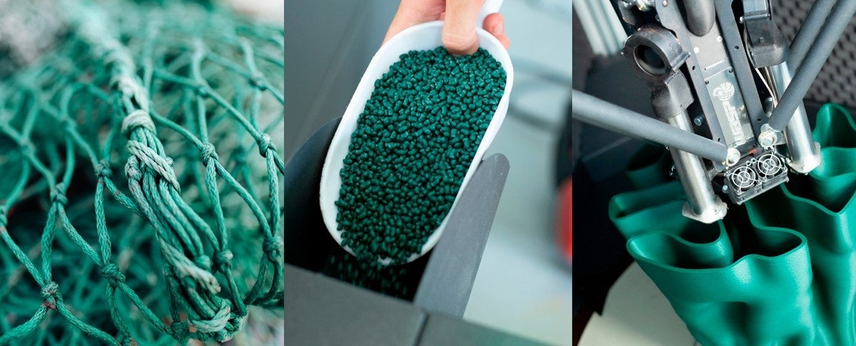 Reflow社は、地元の漁師と協力して使用済みの漁網を回収し、漁網をベースとしたrPPGFの材料開発に成功。その後WASP社とアート作品を造形。漁網からものづくりができることを証明しました。