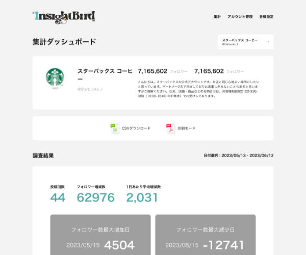 「insightBird」はフォロワー数推移に特化したサービスとなっており、自社調査はもちろん、競合他社も分析可能!イベントやキャンペーンの効果測定をまとめるのに最適なツールになっています。