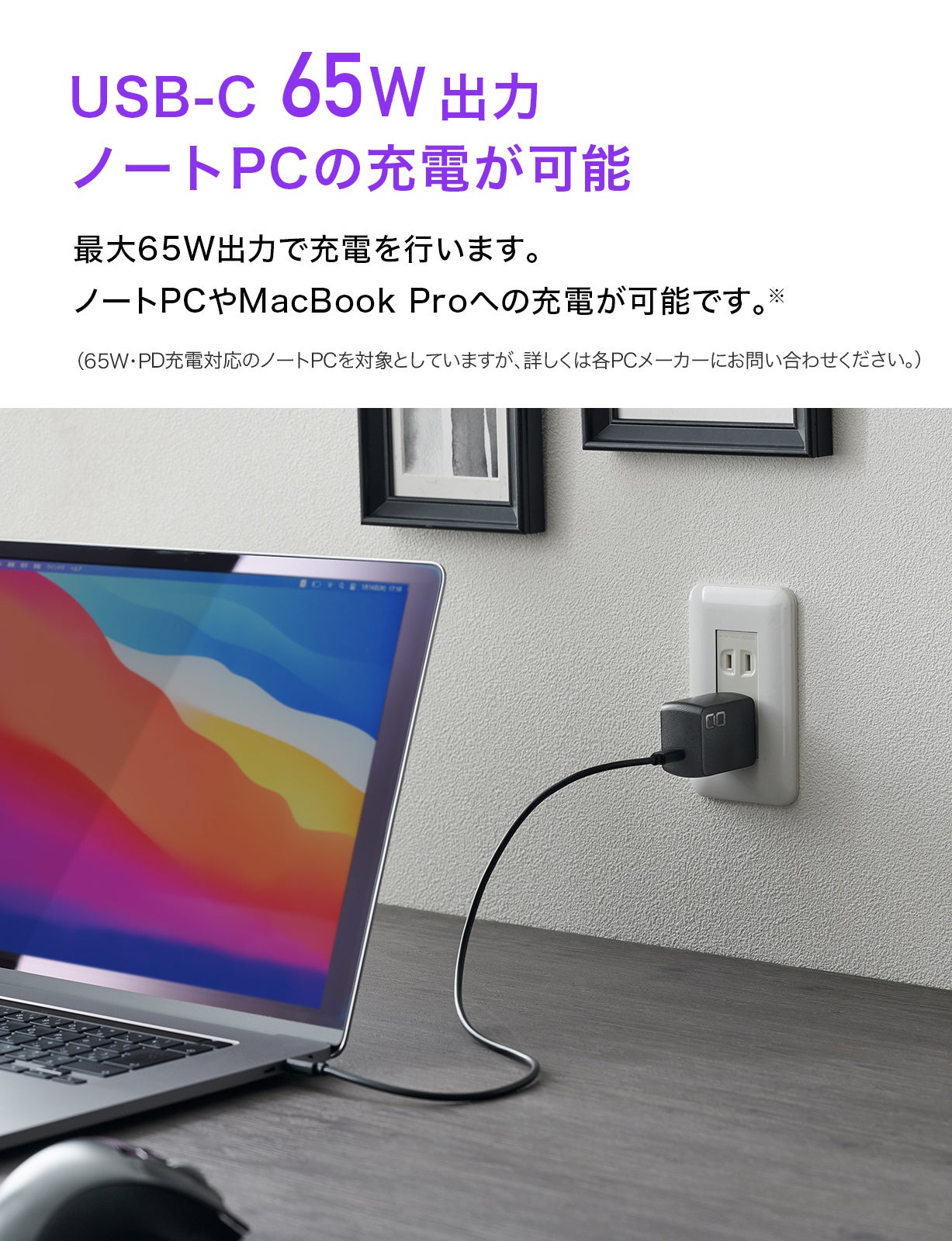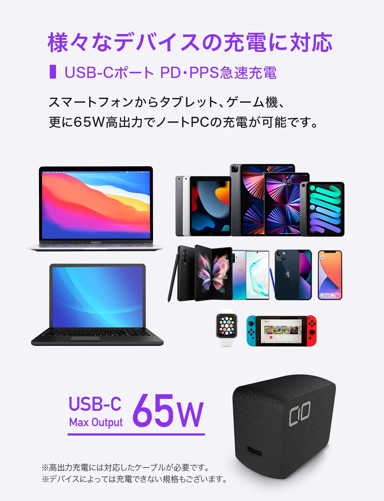 最大65Wまで対応しているのでスマートフォン、タブレットへの充電はもちろん、MacBook Air、Macbook Pro、PD充電対応WindowsPCなど多くのノートPCに幅広く充電可能です。