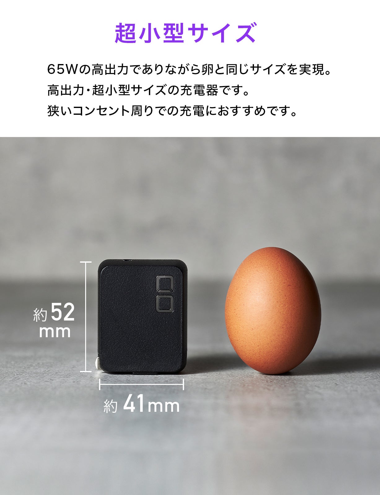 GaNテクノロジーを採用し卵サイズまで小型化しつつ発熱を抑えることが可能になりました。コンセント使用時も他の充電器との干渉を少なく設計しています。