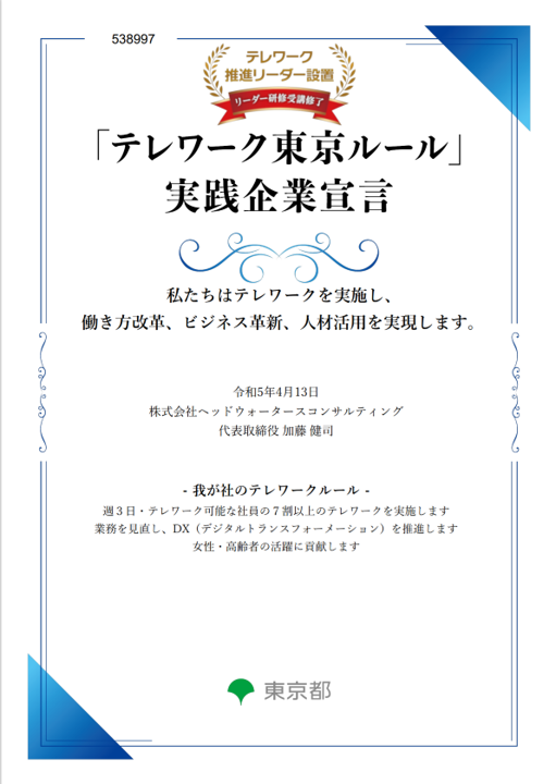 株式会社ヘッドウォータースコンサルティング|宣言企業の検索|「テレワーク東京ルール」実践企業宣言 (tokyo.lg.jp)
