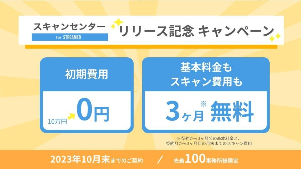 『スキャンセンター』正式リリースを記念して、2023年10月31日(火)までのご契約で、初期導入費用10万円が無料、基本料金とスキャン費用も3ヶ月無料になるキャンペーンを実施します。ぜひこのキャンペーンを活用して、『スキャンセンター』をお試しください。