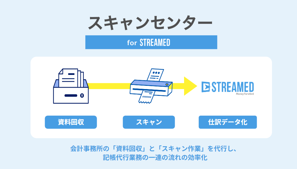 『スキャンセンター』は、『STREAMED』のユーザー向けに、会計事務所の記帳代行業務における「資料回収」と「スキャン作業」を代行するサービスです。『スキャンセンター』に顧問先から資料が送付されると、当社が資料のスキャン作業、および返却業務を代行し、会計事務所にデータを共有します。