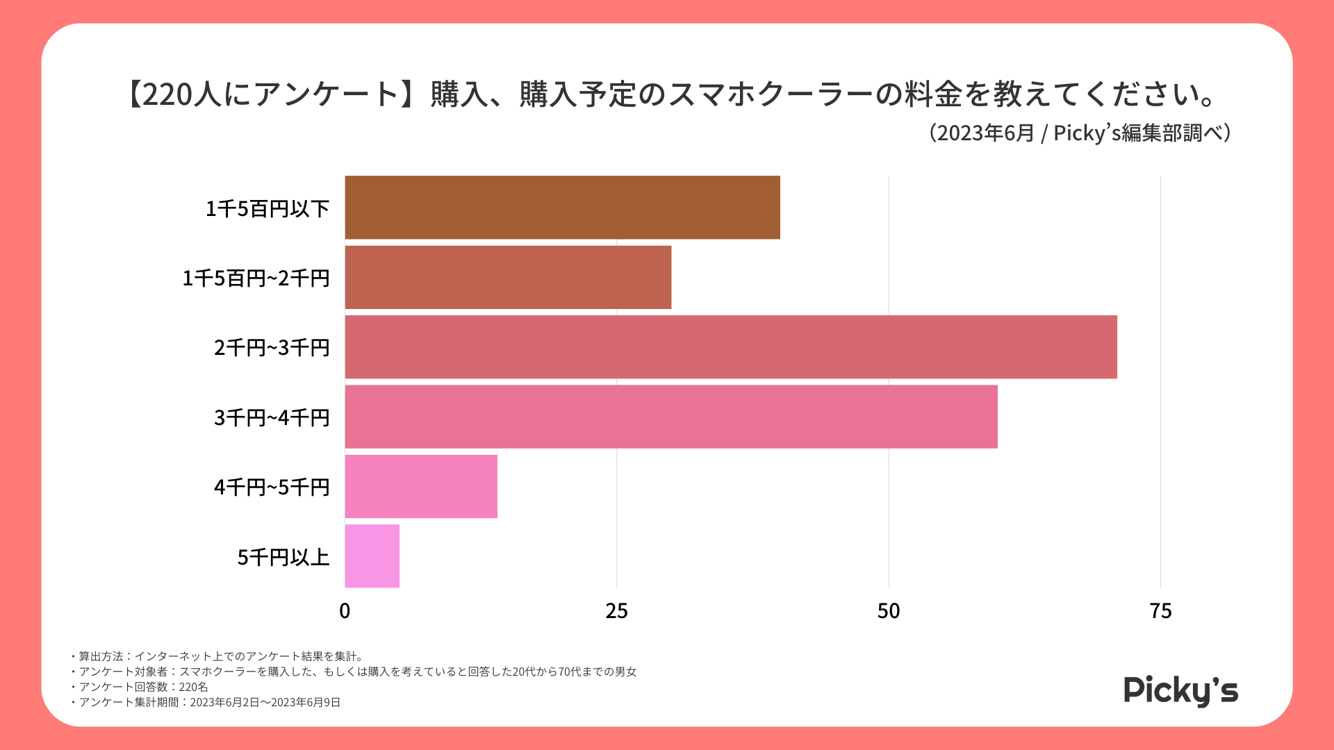 「2千円~3千円」、「3千円~4千円」と回答した方が多い結果になりました。比較サイトやおすすめを紹介している記事を見ると、上位のスマホクーラーは2千円~4千円の価格帯が多く確認されました。人気のスマホクーラーの価格帯であることがわかります。