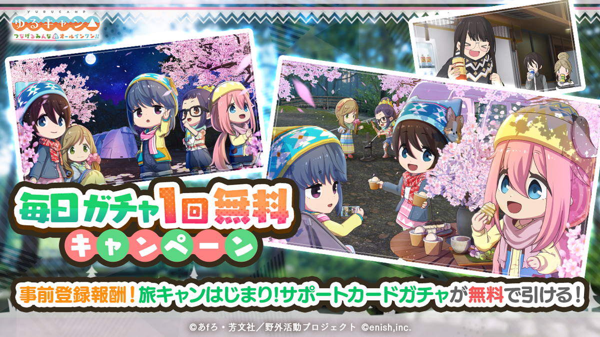 また、ゲームオリジナルのキャンプ服が手に入る【小田原キャンプコスチュームガチャ】やオリジナル旅キャンカードが獲得可能な【旅キャンはじまり!サポートカードガチャ】も同時に開催いたします。
