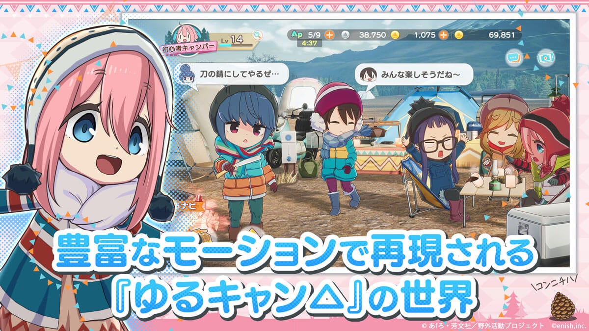 各務原なでしこ、志摩リン、大垣千明、犬山あおい、斉藤恵那など、おなじみのキャラクターのモーション&フルボイスの豊富な掛け合いや、1,000を超えるキャンプギアや乗り物、美味しそうなキャンプ飯、山梨・長野・静岡を中心とする各地の美しい景色など、TVアニメ『ゆるキャン△』の要素が続々登場予定です!