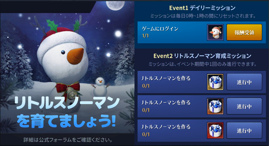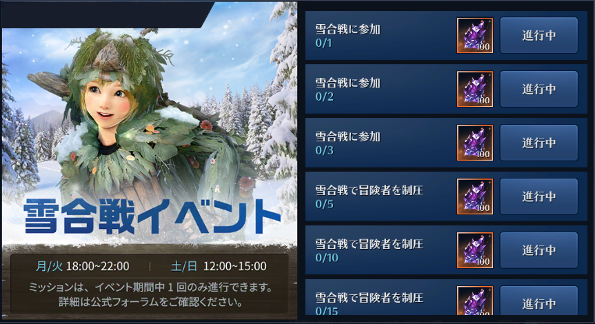 イベント期間中、特定日に「雪合戦イベント」が開催されます。用意されたミッションをクリアすることで報酬を獲得することができ、全て完了することで、冬をイメージした外見装飾が獲得できます。是非ご参加ください。「雪合戦イベント」の内容など詳細は以下URLをご確認ください。