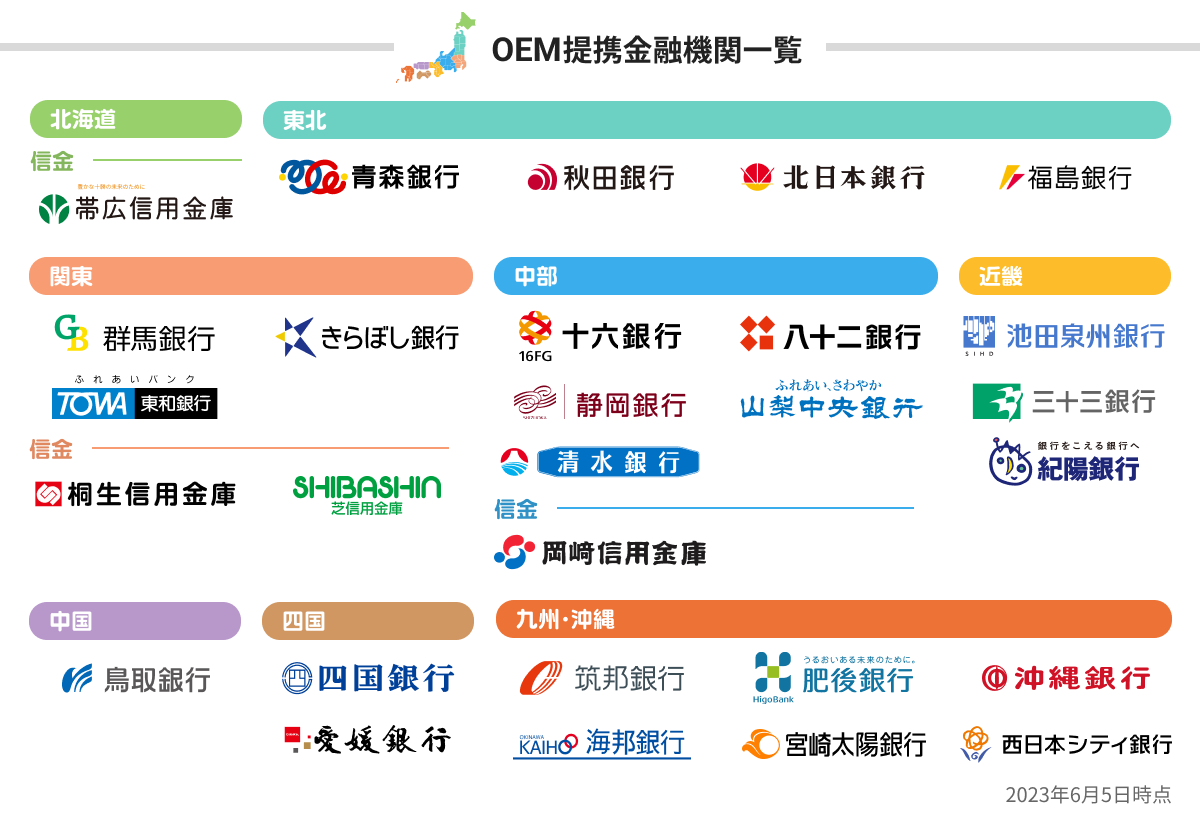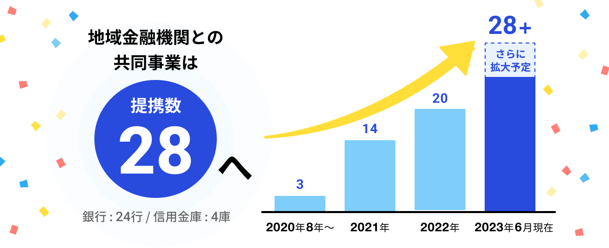 2020年8月より金融機関へのOEM提供を開始し、現在では全国28の地域金融機関と提携。「提携銀行数No.1」※1で多くの中小企業や小規模事業者にご利用いただいており、サービス提供開始から5年弱で累計申込金額は1,000億円を突破※2しています。