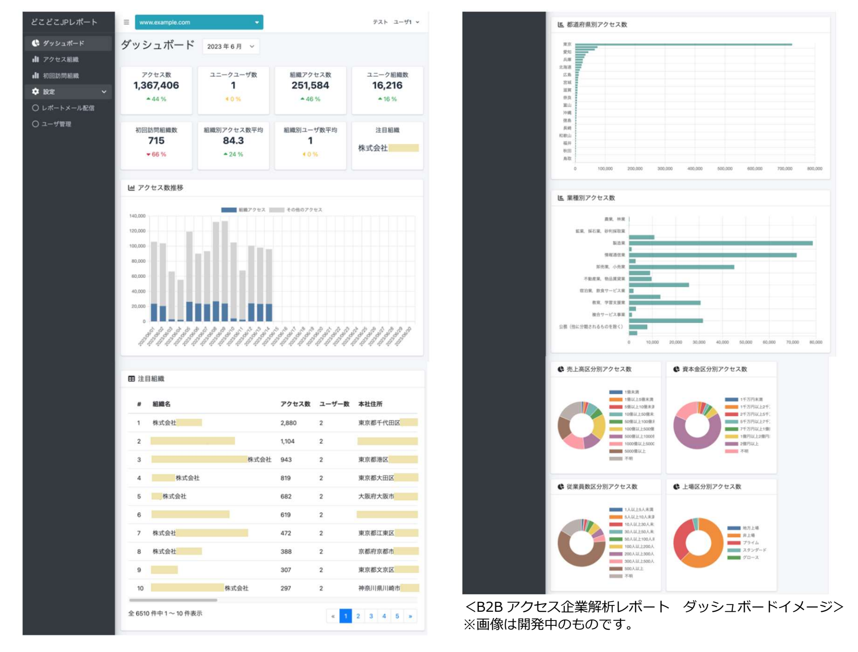 「B2Bアクセス企業解析レポート」は、「どこどこJP」と連携しているホームページにアクセスしてきた企業を分析でき、そのアクセス企業に対する営業担当者のアプローチを強力に支援いたします。当社の独自のデータであるIP Geolocationデータを活用することで「企業名(組織名)」、「業種」など多様なデータを取得し、初回訪問企業(組織)の特定や特定の企業(組織)訪問回数、ユニーク組織数など分析、これらの情報をシステムで自動的かつ視覚的に作成し、閲覧できます。またこれらの情報は、Web担当者や営業担当者など複数のユーザーに定期的にメールで配信されるので、自社に興味を持った企業へのスピーディーなアプローチが可能です。またGoogleアナリティクスアクセス解析ツールとの連携が不要で、「どこどこJP」のレポート専用ページから簡単に閲覧できます。自動作成されたレポートは、管理者が指定した複数のユーザーに公開することができ、セールス部門やマーケティング部門の責任者、担当者など、関連部署間の情報共有が可能です。アクセス組織のIPアドレスのリストを出力できるため、ディスプレイ広告配信サービス「どこどこad」などの別サービスとの連携も可能で、この「B2Bアクセス企業解析レポート」の活用により担当者の業務効率を上げ、効果的なBtoBセールス活動をサポートいたします。