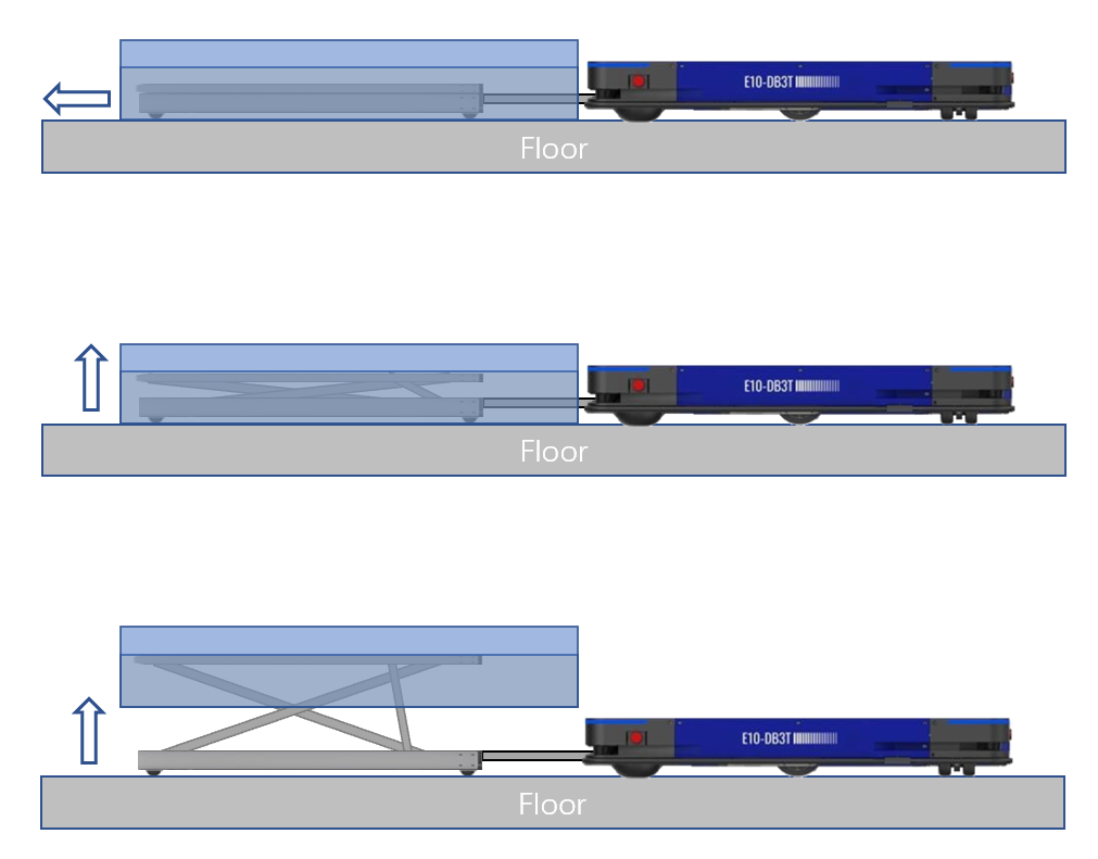 1.低床の台車や車輪付き台車も搬送可能:従来のAGVは台車やパレットの下に潜り込み、リフトアップする方式をとっているため、低床の台車や車輪の都合で使用できないケースがありました。本AGVはフォークリフト用に爪を伸ばし、持ち上げる方式を取っているため、AGVの導入を諦めていた工場にも導入が可能です。