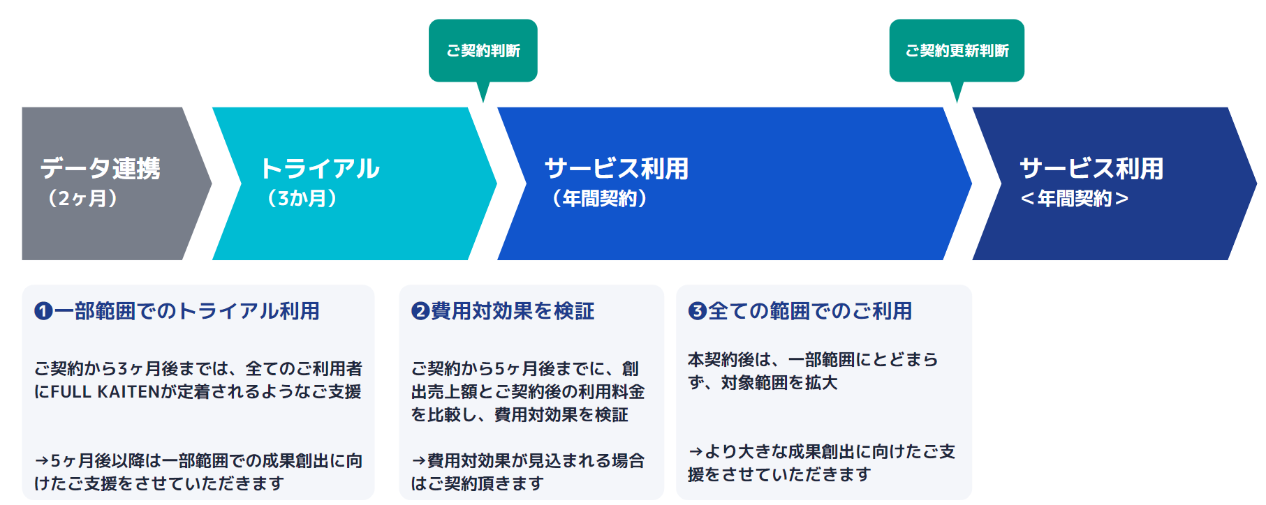 FULL KAITEN〈在庫配分〉では初の試みとして、3か月間のトライアル期間を経て創出売上と費用対効果を見て頂いた後に、本契約に進むかどうかの判断をして頂く流れを予定しています。それに併せ、30社限定でトライアル料金が半額になるキャンペーンを実施します。