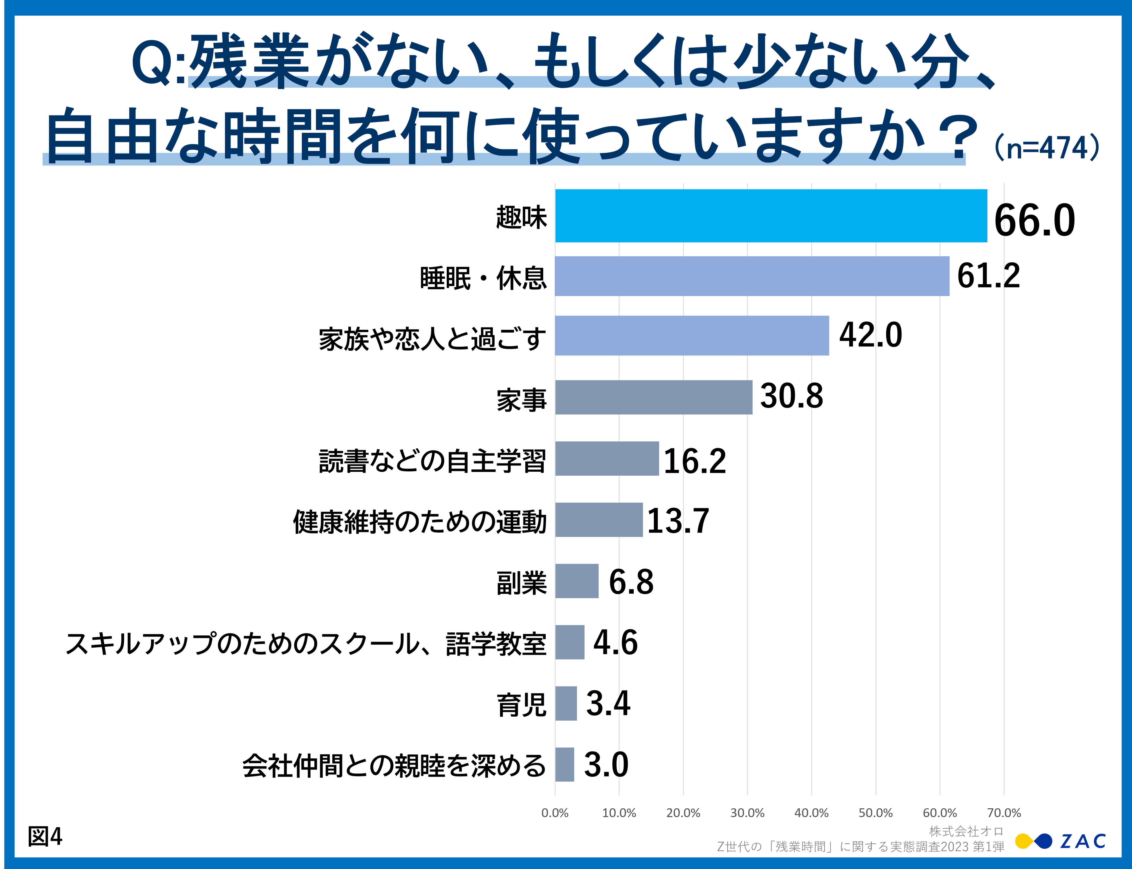 プライベートを重視するZ世代は、特に「趣味」の時間を大切にしていることがわかる結果となりました。また、「自主学習」や「スクール」などの自己研鑽に時間を使う、「副業」を行うなど、残業がない(少ない)ことでできた時間を、様々な用途で有効活用していることがわかりました。(図4)