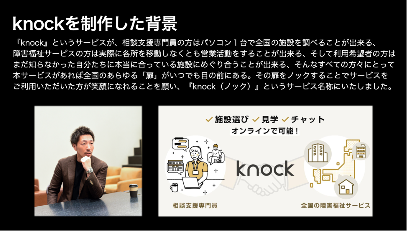 またこのサービスが浸透した未来を想定すると、県や市を跨いでの施設入居は行政の制度面が課題となる事例も出てくると思うので次のステップとしては行政が横の繋がりや壁をなくし、利用希望者が望む生き方を尊重できる制度に変化していくことが必要になると思います。このknockというサービスがその突破口となればいいと思います。』