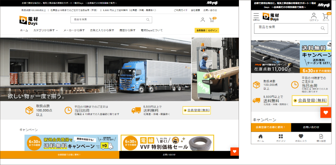 「電材Days」は、当社が長年培ってきた1,000社以上のメーカー様・商社様との関係づくりによる10万点(今後20万点に拡大予定)を超える取扱商品と、弊社の物流システムをベースに、お客様に必要な商品をお得な価格でお届けするためのECプラットフォームです。