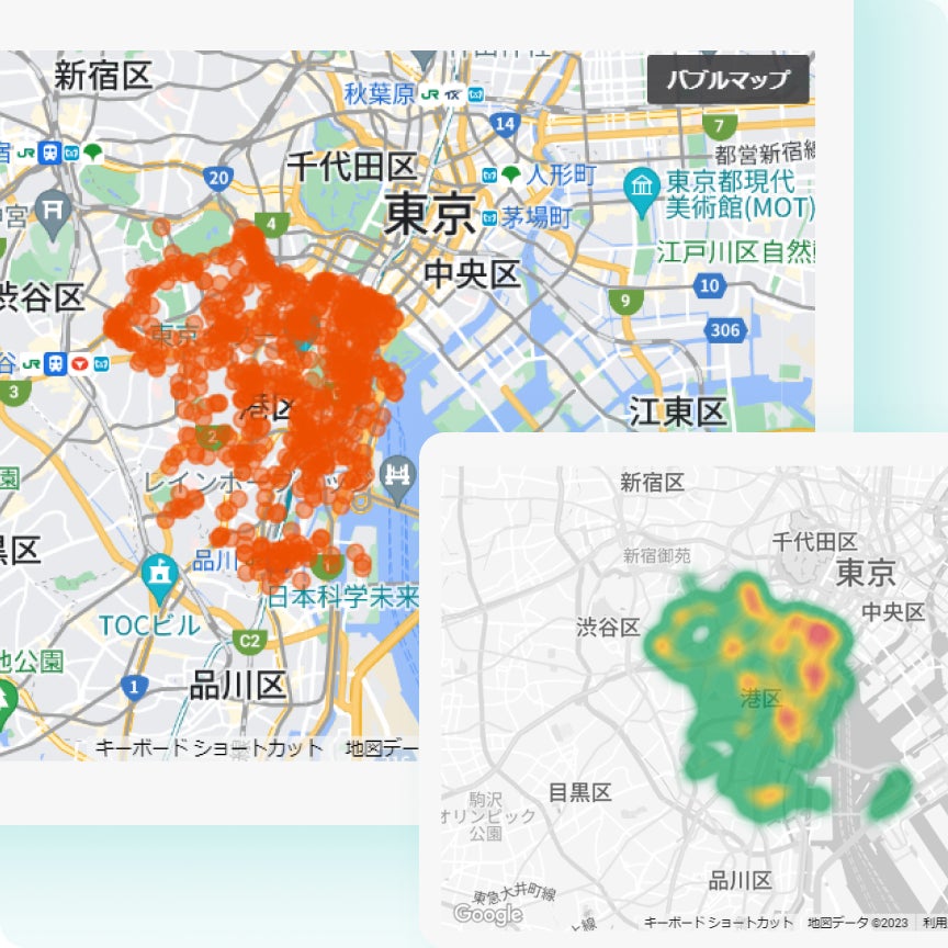 利用者の住所情報をもとに、利用者MAPとヒートマップを自動作成可能です。どのエリアの利用者を獲得できれば、効率的に訪問件数を伸ばすことができるかを瞬時に判断できるようになります。