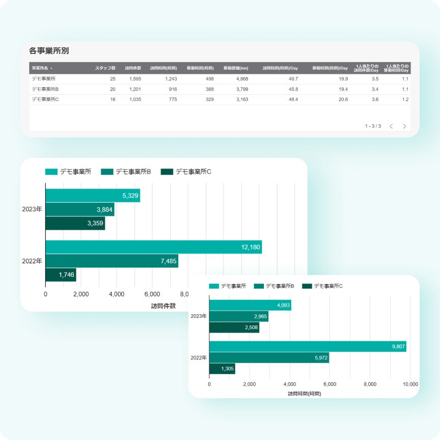 -訪問件数や訪問時間を日別や曜日別などに加え、保険種別やスタッフの資格別のデータ