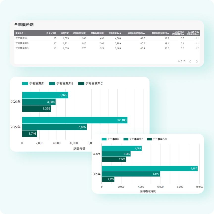 -訪問件数や訪問時間を日別や曜日別などに加え、保険種別やスタッフの資格別のデータ