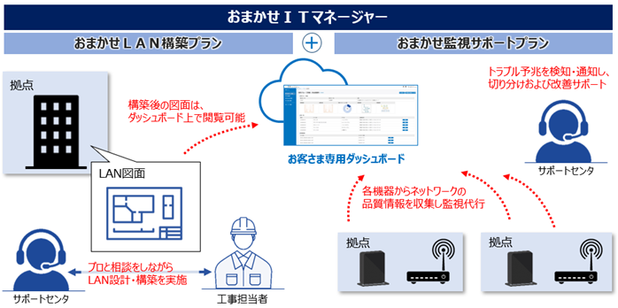 本サービスは、LAN環境をご相談しながら設計・構築する「おまかせLAN構築プラン」と、ネットワーク機器の監視を行い、トラブルの予兆検知・通知や改善提案等を行う「おまかせ監視サポートプラン」を提供するサービスです。LAN構築後の図面および監視による予兆通知とレポートをお客さま専用ダッシュボードにて提供します。