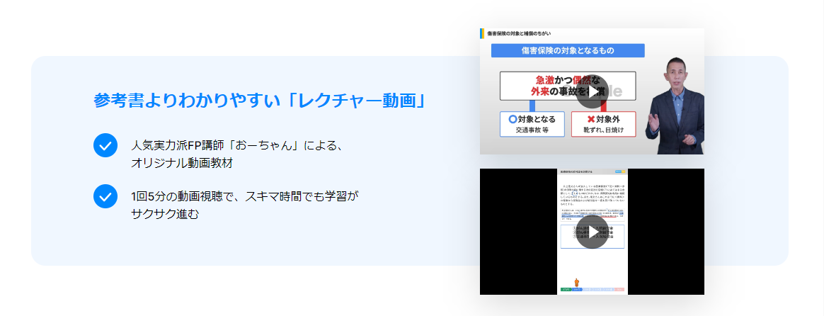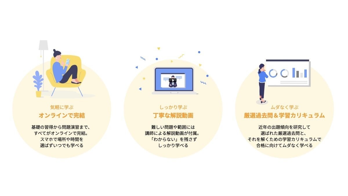 本サービスでは、動画によるプロ講師によるレクチャーと頻出問題が厳選された過去問演習をオンラインで手軽に行うことができ、スキマ時間で資格学習に取り組めます。